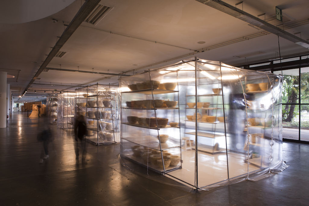 The exhibition exceeded the limits of its iconic building, a renowned modern architectural project by Oscar Niemeyer located in São Paulo’s largest park. Alvaro Razuk’s exhibition design relied on few walls and generous spaces that respected each work’s autonomy while encouraging the interlacing of ideas, and was successful in letting the park enter the site of the exhibition, which proposed opening up to different points of view and methodologies about living together, not only as humans but as members of an interspecies community. In fact, this edition was nicknamed the “Biennial of Mushrooms” in reference to artworks such as Nomeda and Gediminas Urbonas’s “psychotropic house,” and the resin mushrooms scattered around the park by shaman-artist Alicia Barney.